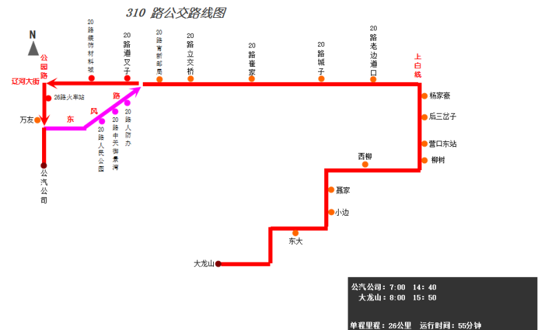 由公汽公司始發(fā),途經(jīng)公園路、建設(shè)街東風(fēng)路/遼河大街、遼河大街、營大路、上白線、營口東站路口、柳樹鎮(zhèn),終點(diǎn)到達(dá)大龍山
